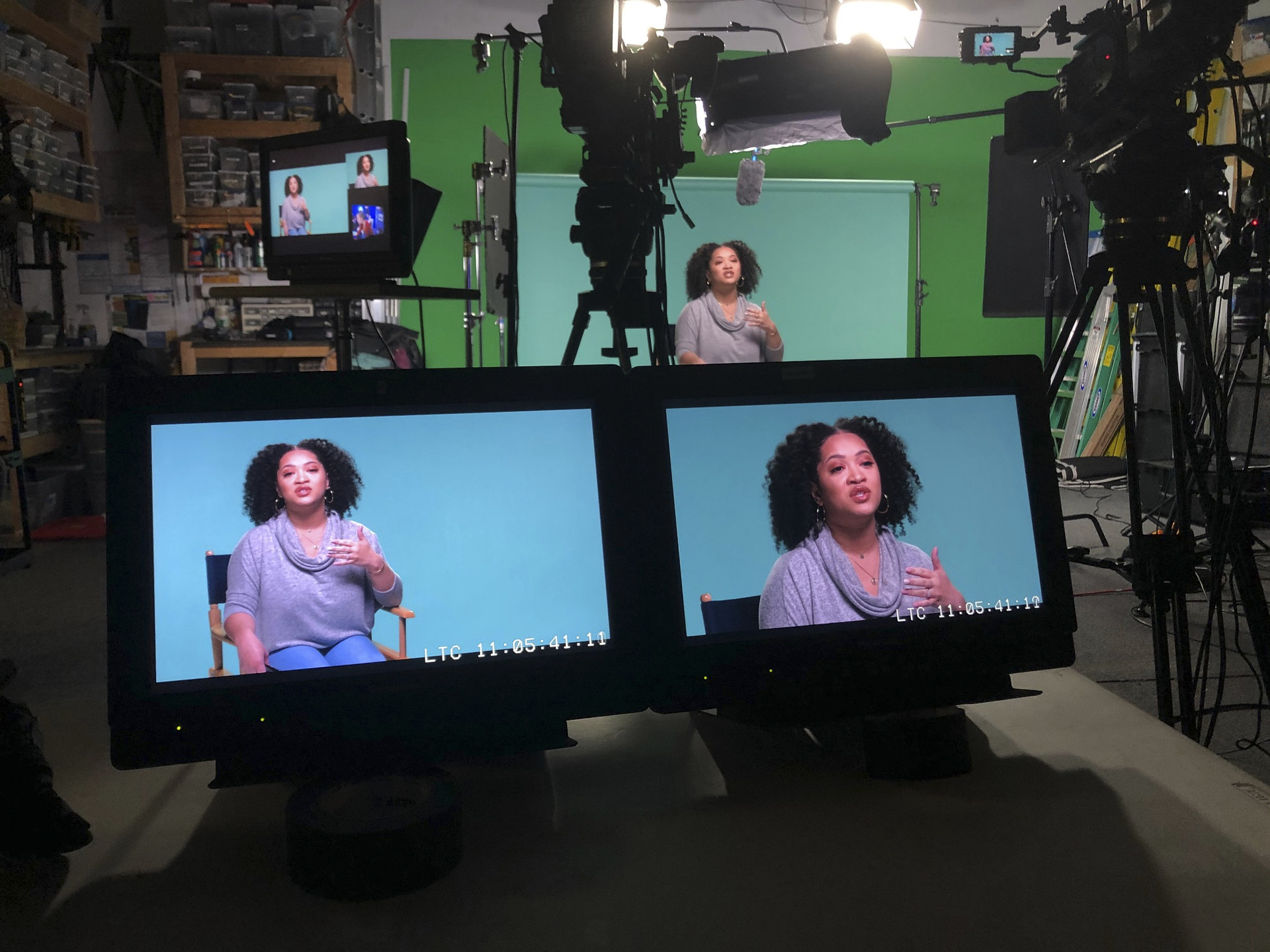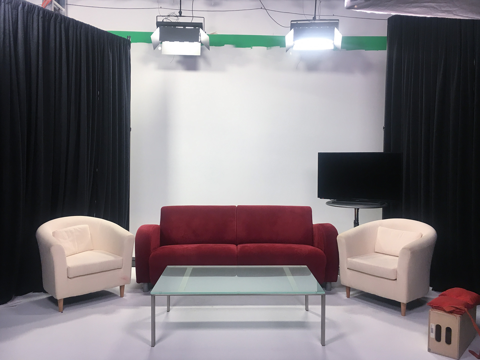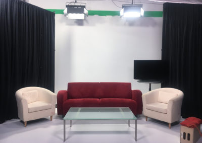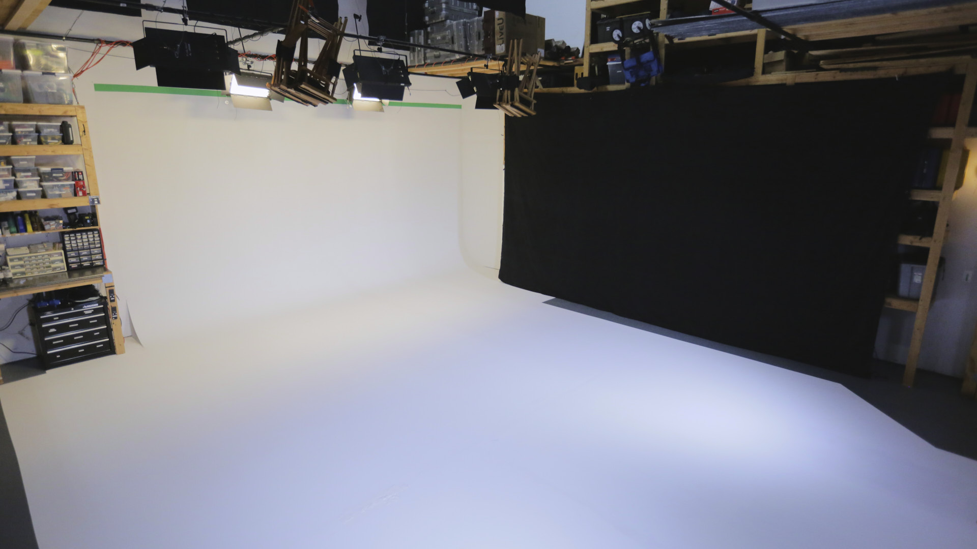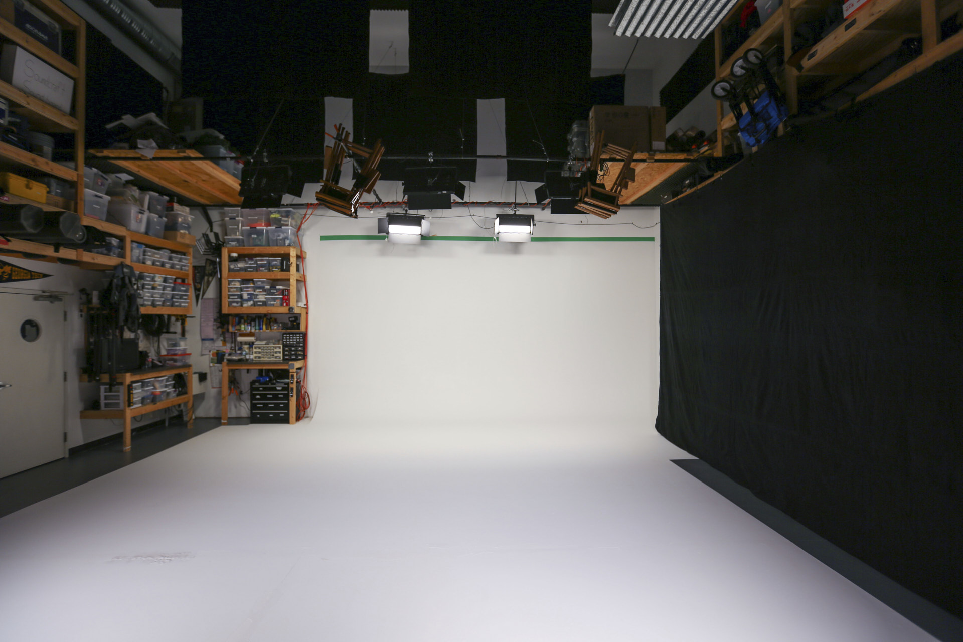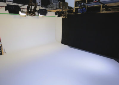 Get a closer look at some of the many features  of our studio such as the cyc wall, the green room, and the kitchen.